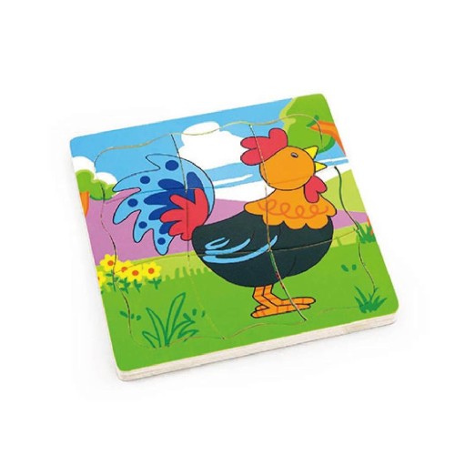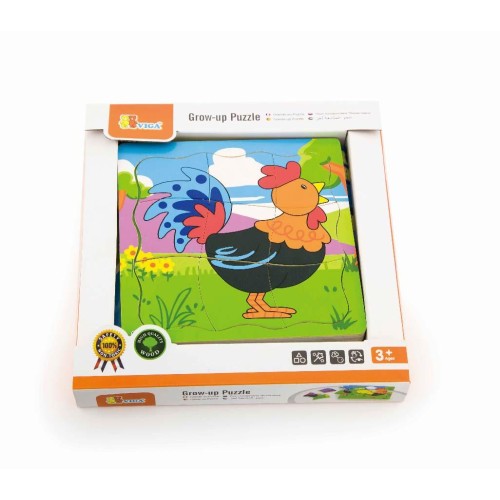 Each multi-layer puzzle contains 4 different pictures illustrating the transformation of an egg to a rooster.