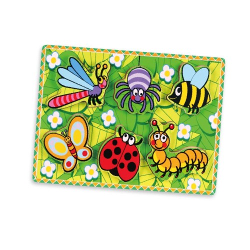 Garden insect favourites are featured on this extra thick wooden puzzle. Six easy-grasp, chunky insect pieces. The pieces stand upright for pretend play.