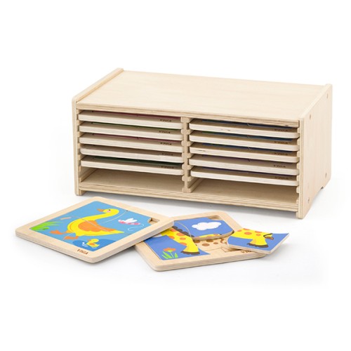 The wooden stand contains a set of 12 puzzles, each puzzle consists of 4 elements and a frame with a pattern-tip.