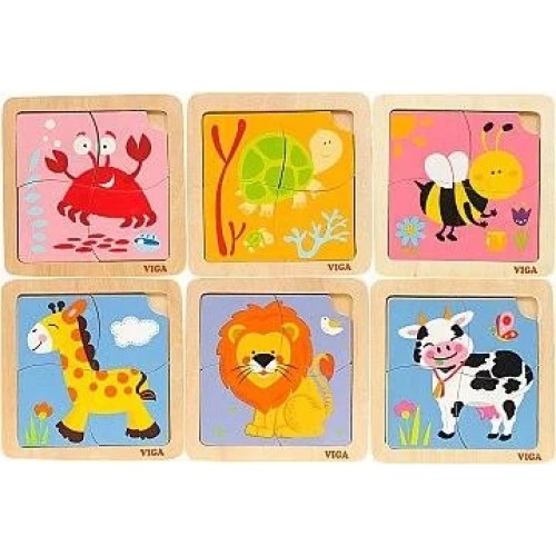 Set contains puzzles of: butterfly, bee, ladybug, turtle, fish, crab, horse, cow, duck, lion, zebra, giraffe