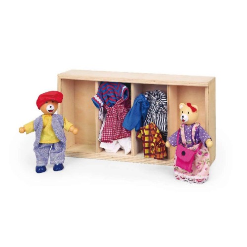 Includes 2 bear dolls, 6 suits of clothes, 1 pink purse, 1 green backpack, 1 red cap, 1 pink hat.