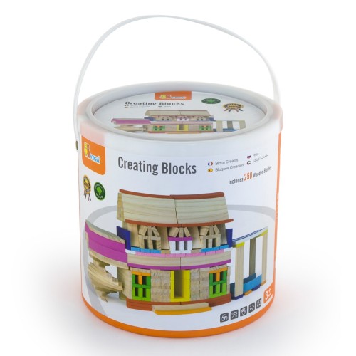 This 250 pcs wooden block set includes 150 pcs natural wood blocks and 100 pcs colourful blocks of 10 different colours.