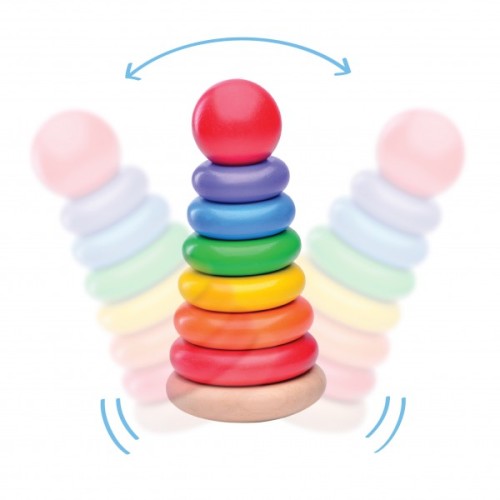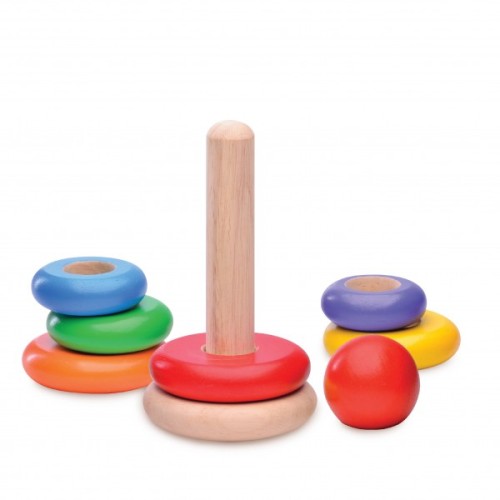 A brightly coloured, traditional stacking toy.