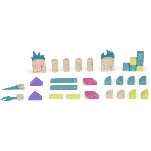 Includes 30 pieces in 11 shapes; 2 Short Planks, 2 Long Planks, 6 Cubes, 2 Triangles, 2 Parallelograms, 8 Monster Horns, 4 Monster Legs, 1 Beans Horso, 1 Tumtum Horso, 1 Beans Tail, 1 Tumtum Tail