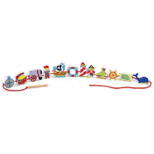 The lace has a solid wooden end so it's easy for younger children to thread. The wooden block are double sided and can be used as standing wooden figures.