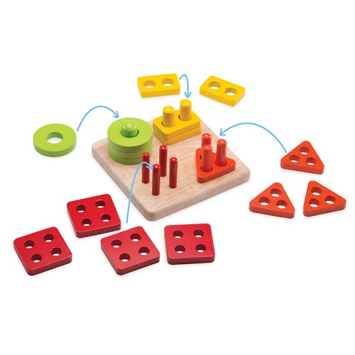 Learn all about shapes and number through this simple stacking function, matching basic shapes and colours. The different sizes of the pole will also stimulate curiosity of the children to help them find a way to solve the problem.