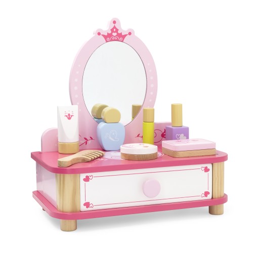 Includes a wooden dressing table, wooden make-up and wooden comb.