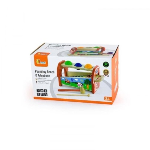 Place the 3 balls on top of the pounding bench, use the hammer to pounds the balls through the holes, once a ball drops it will strike the xylophone keys making different sounds.