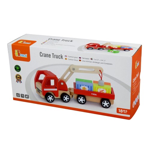 This beautiful red wooden crane truck comes with four container blocks to play with.