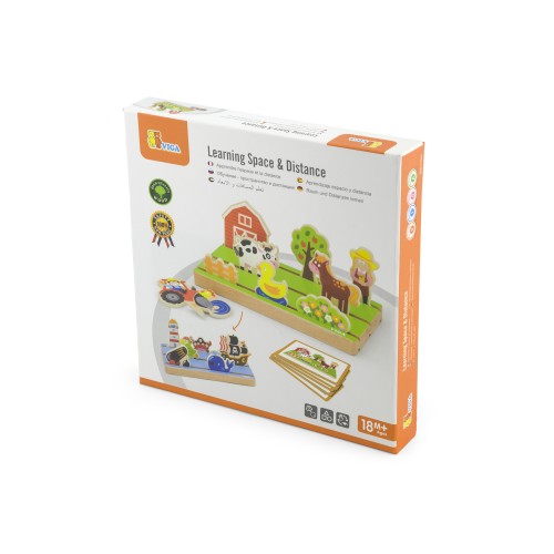 This learning space and distance toy is made of solid wood. It contains 6 blocks and a base pad with grooves.