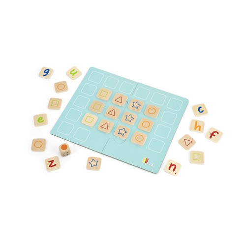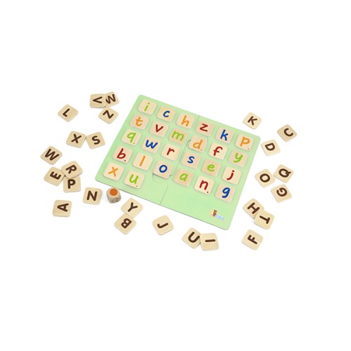 Matching and memory game 2 in 1. Contains 28 lowercase letters, 1 big dice and a board card.