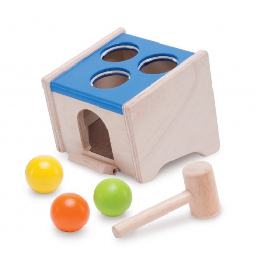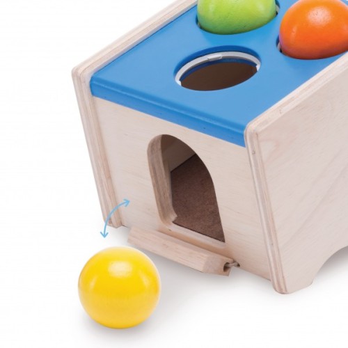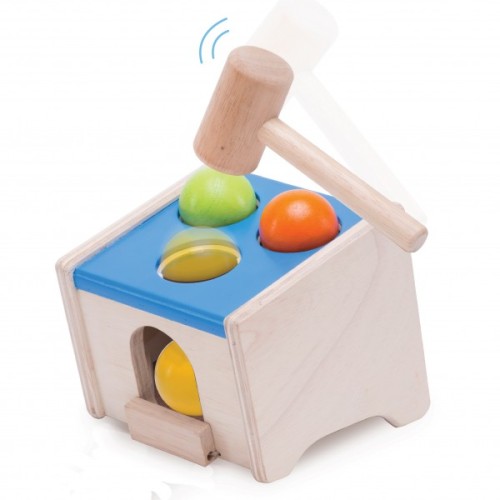 Pounding toy design with a sloping base to enhance vision when children are playing, increasing the fun as balls are automatically roll down to the exit.