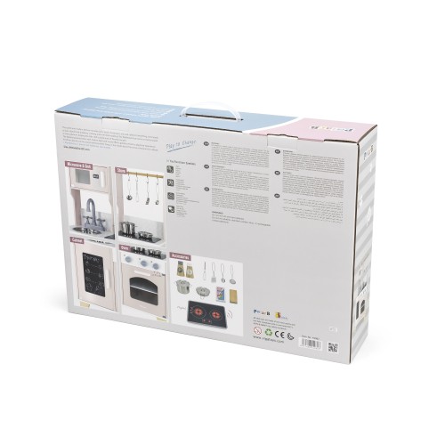 This stylish and modern kitchen includes oven, stove, microwave, sink and cabinet. Everything a kid needs to learn about food prepping, cooking, and even dish washing!