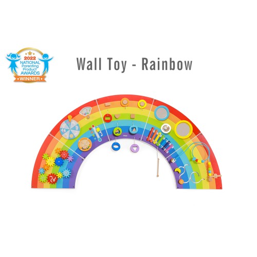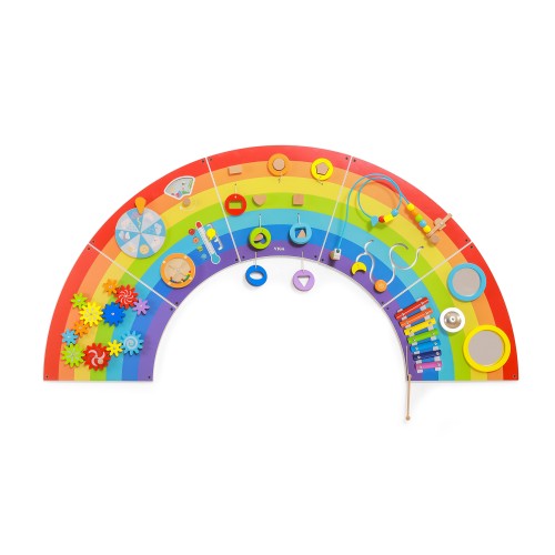 This rainbow wall toy includes 12 activities: turning gears, weather board, rolling disc, matching shape blocks, xylophone, concave and convex mirror, gong, and wire beads with a flipper.