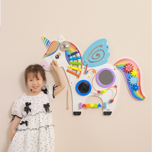 This beautifully designed unicorn wall toy includes popular features such as turning gears, wire beads, xylophone, concave and convex mirror, gong, etc.