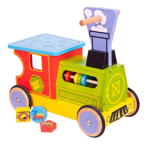 Includes wooden handles that are perfectly sized for little hands, sturdy wheels and a shape sorter.