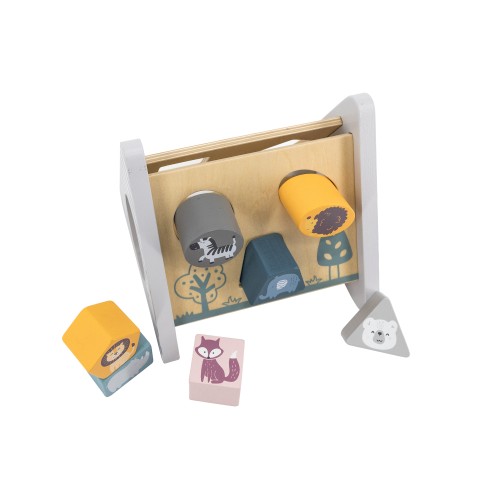 The game set consists of gears for torsion on one side, sorters on the other sides, and colour forms with the image of animals.