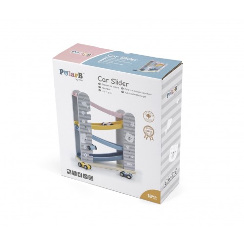 The set consists of a 4-level track and 4 cars that easily glide along tracks from top to bottom.
