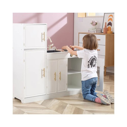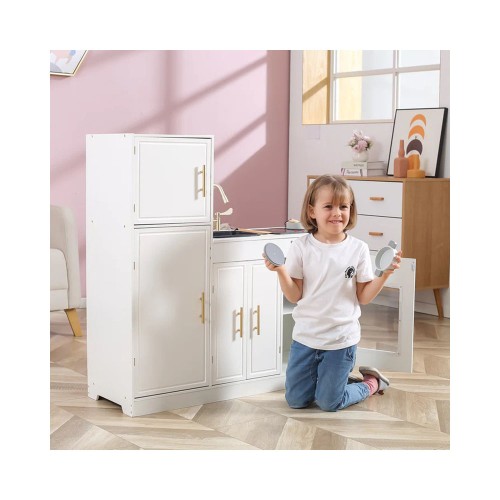 This contemporary nordic style kitchen set includes refrigerator, sink, convenient cabinet, stove, and oven. The interactive light and sound stovetop will delight your little ones and indulge their sense in every way - the red stove lights up and makes bubbling sounds as you cook.
