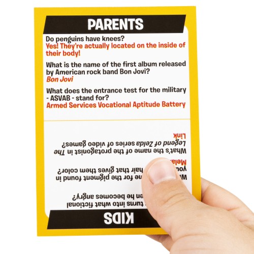 Go head-to-head in a battle of household supremacy with Beat the Parents, the fun-filled family trivia game! Prove who’s really the boss in this game of smarts and skills. Parents will have to answer questions about kids’ stuff, and kids answer questions parents should know. As teams answer trivia and move across the game board, they’ll encounter wacky challenges they need to complete.