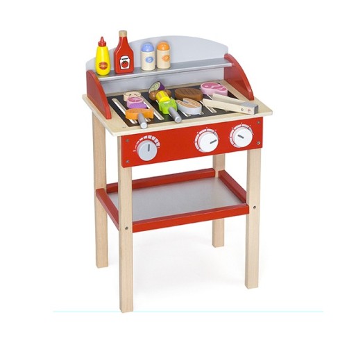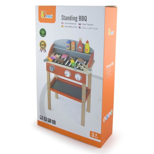 This standing BBQ includes 2 wooden skewers, 1 set of tongs, 4 seasoning jars and a selection of wooden sea food, vegetables and meat.