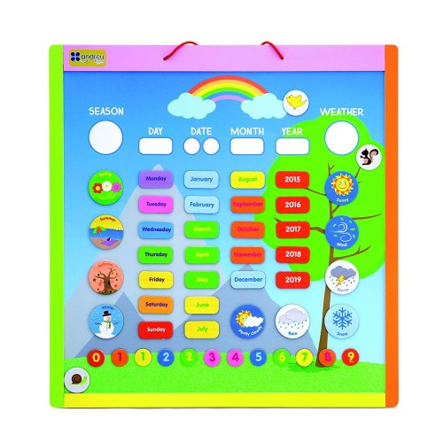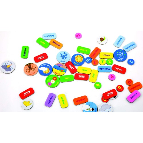 Includes 50 magnetic pieces for children to learn about time, dates, days, months, seasons, years, weather and activities.