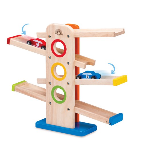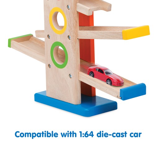 Enjoy watching these brightly coloured cars rolling down the tracks, with a special gate to open or close the 1st storey track to release or store cars.