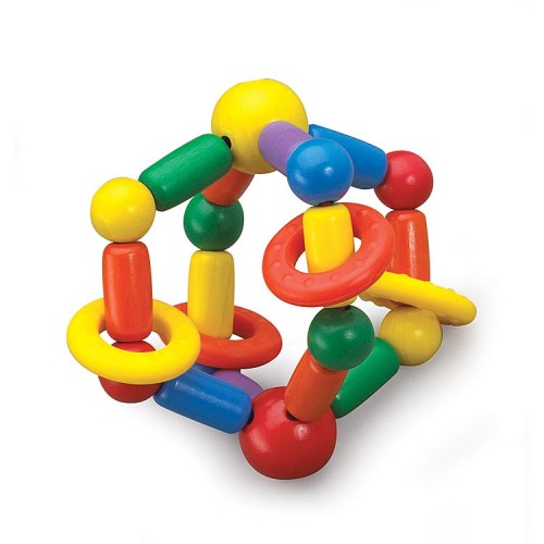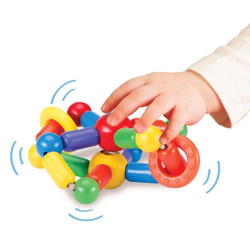 This Twist and Roll rattle is bright and colourful, with a jingly bell and wooden beads - and it springs back into shape when squashed!