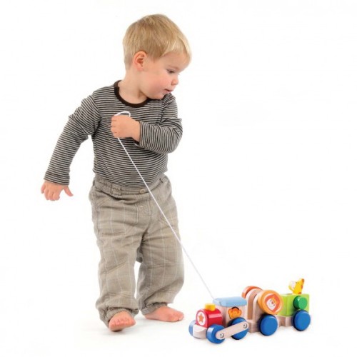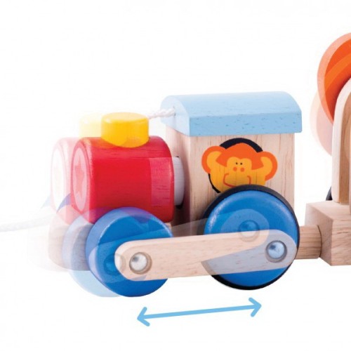 A fun and colourful Pull Along Safari Train, with a detachable locomotive and moving animal characters.