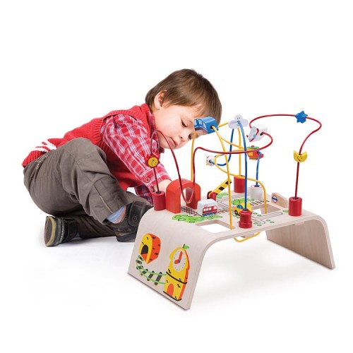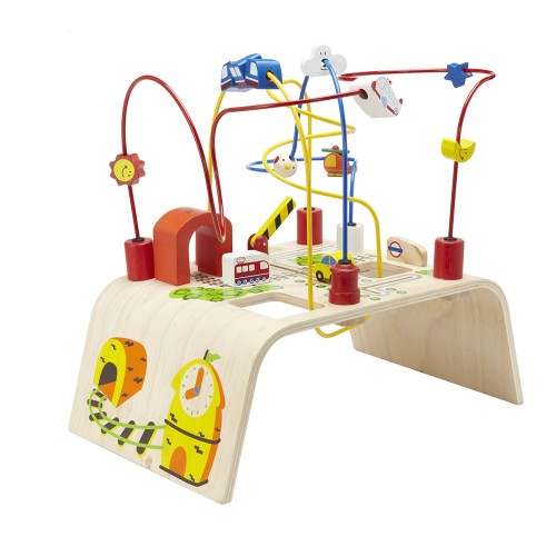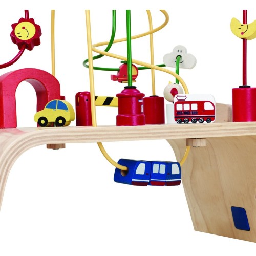 A large and colourful bead frame, which is based around a city design, with wooden cars, a train, plane, helicopter and sun that can be moved along the wires and the track on the base.