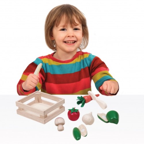 Your child can pretend to cut open the pre-cut vegetables with wooden knife and serve to their guests.