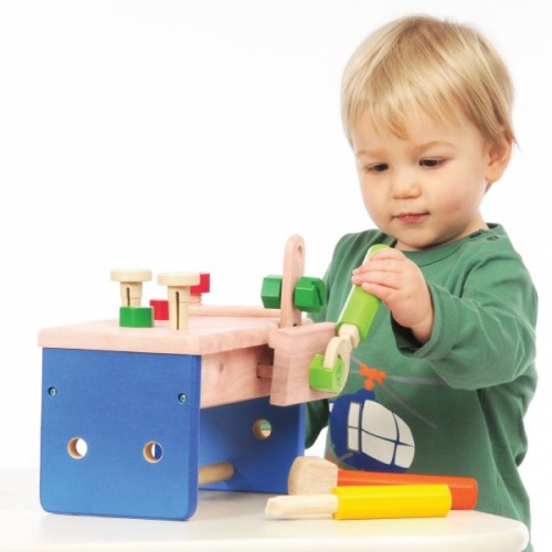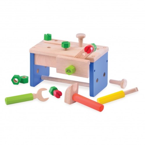 A compact-sized work bench that functions just like the full-scale work bench, complete with tools and accessories.