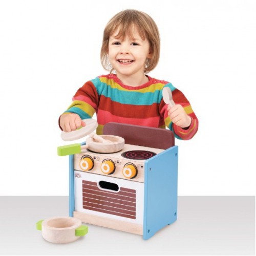 There are two hob rings plus an oven with temperature and timer controls. Set also includes cooking pots and cookies.