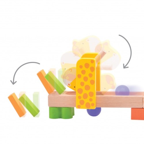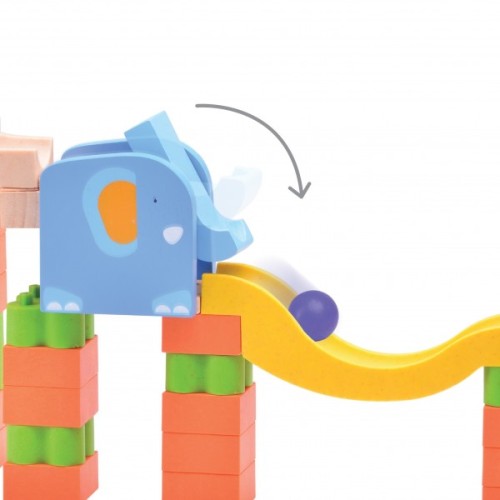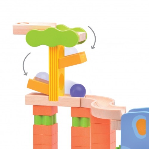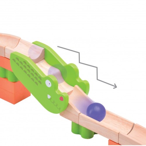 A set of wooden balls and tracks that uses a brick locking system for better stability during use.
