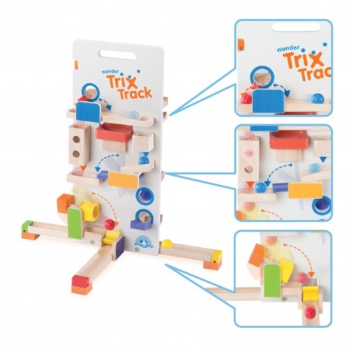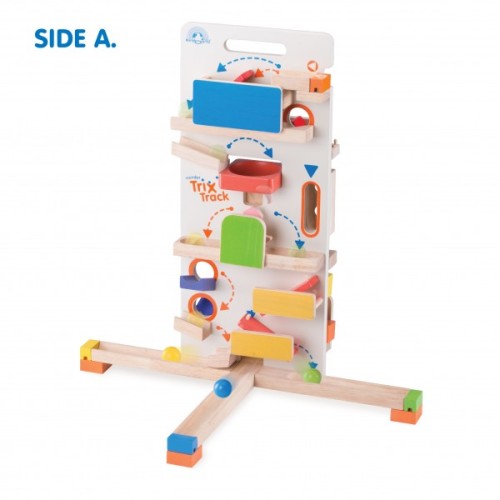 A portable double-sided ball and track board, the balls run vertically and roll out in 4 different directions.