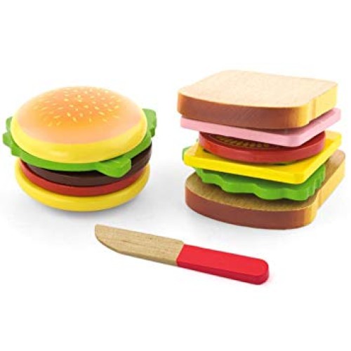 Set includes a knife and 10 pieces to make a healthy hamburger and a sandwich.