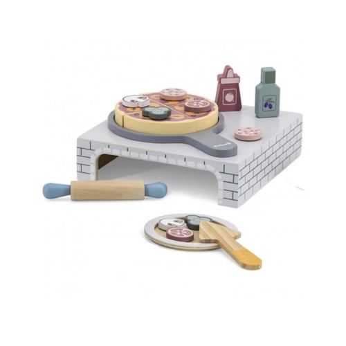- a wooden pizza, spatual, two bottles of sauces, a plate, rolling pin, variety of toppings and it's very own pizza oven.
